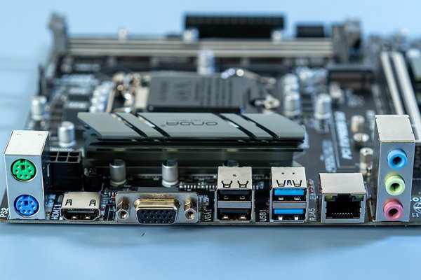 昂達B460SD4主板的后置接口同樣豐富,最頂端2個PS/2接口,再往右則是HDMI和VGA接口,中間2個USB 2.0和2個USB 3.0接口,最底為音頻接口,在USB 3.0和音頻接口之間還有一個RJ-45網線接口。
