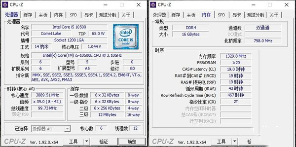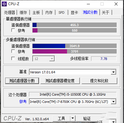 CPU-Z確定處理器性能、雙通道內存。在CPU-Z內置的Version 17.01.61的性能基準測試中,i5-10500受制于頻率,單核性能沒有達到i7-8700K的水平,但同頻下性能相差無幾;多核心性能的差距大幅縮小。