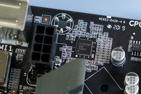 供電方面,CPU使用一個單8pin供電接口,內存右側是傳統的24pin設計。8相的供電設計中,滿足所有不超頻第十代處理器的給電需求。供電控制芯片采用旗艦Z490主板常用的RT3609BE,帶來更精細的電流、電壓管理。