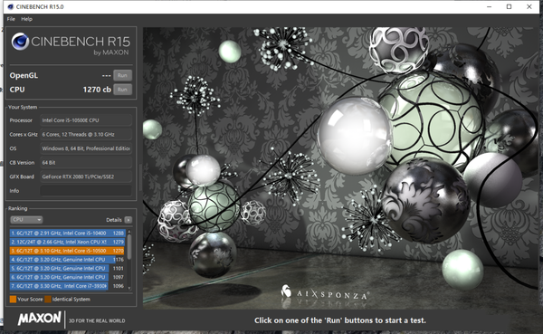 最后CineBench R15性能測試中,CPU得到1270cb;CineBench R20的得分3073cb。
