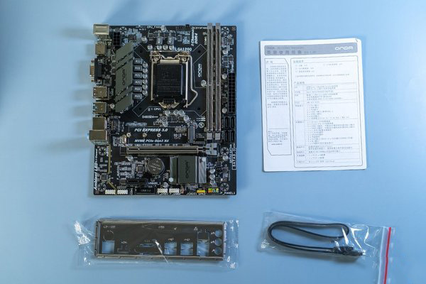 昂達B460SD4外包裝采用極簡的設計風格,采用黑色的主色調,正反兩面除了B460SD4型號和支持DDR4內存、LGA 1200插槽的特性。包裝盒除了一片昂達B460SD4主板外,附件還有一條SATA線、一份使用指南和一塊IO擋板。
