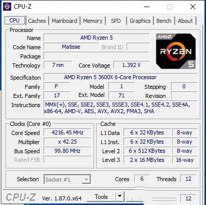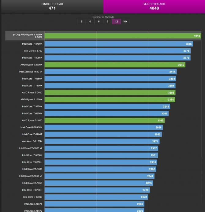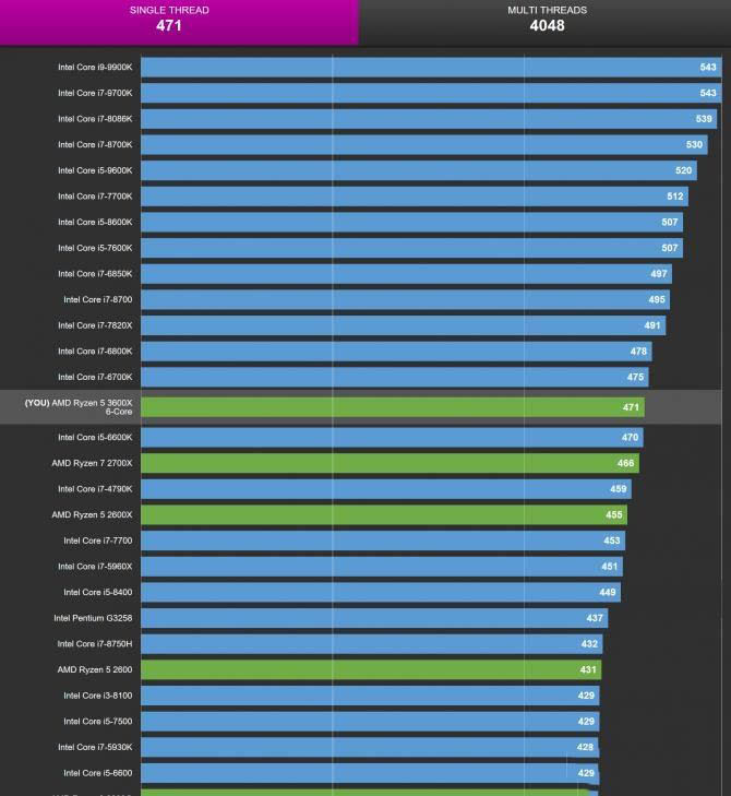 通過CPU-Z的跑分測試,從上圖可以看出銳龍5 3600X單線程性能和i7-6700K幾乎持平,i7-8700分數也只相差20多分。多線程性能上銳龍5 3600X就爆發了,分數超越i7-8700K,對于一款售價只有1999元的CPU來說真的“超香”。