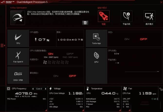 在日常使用上,華碩自家開發的一批配套軟件也是非常好用。首先看到的這個AI Suite3軟件集合監控、超頻等功能,玩家可透過軟件簡易調整電腦的性能,以及控制風扇轉速等功能。