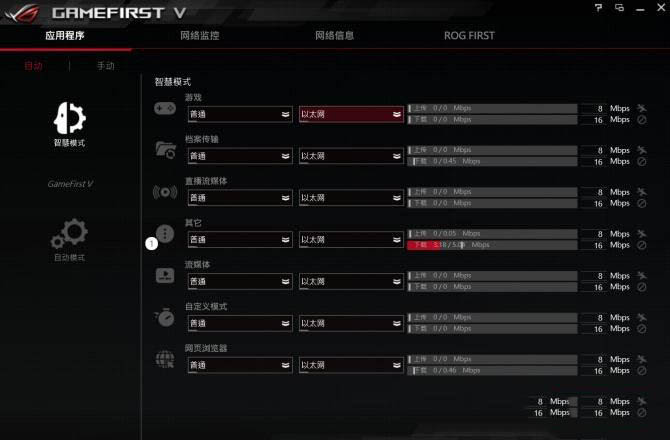 GameFirst V通過應用程序區分網絡優先權,并可妥善分配(或手動)雙LAN與Wi-Fi的使用帶寬,多網絡使用上更便利。比如上圖就可以直接通過GameFirst V發現哪些軟件正在占用著上行和下行帶寬,比絕大多數路由器軟件好用許多。