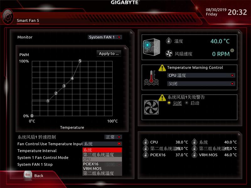 B365M Aorus Elite主板集成了1個CPU風扇4pin、3個4pin機箱風扇接口。4個風扇都可以單獨依據CPU、MOS、主板或者機箱內部溫度來設置溫度曲線??梢灾С值拓撦d下風扇完全停轉,減少噪音。