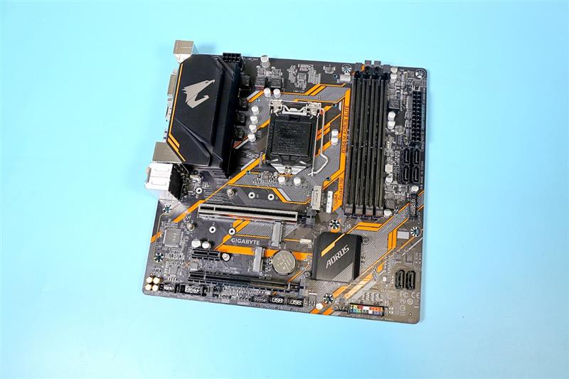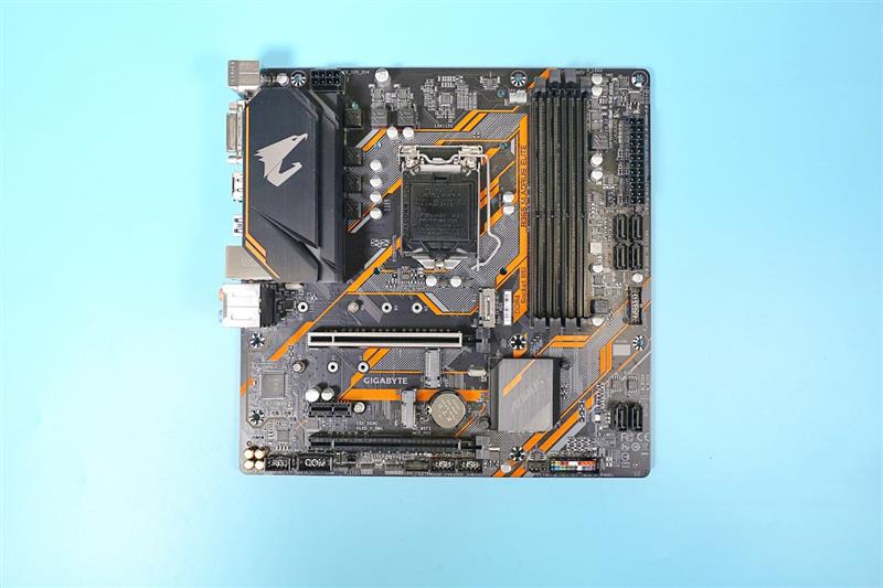 技嘉B365M Aorus Elite主板整體采用黑橙配色,電容類等元器件和技嘉“小雕”則以原汁原味的銀色金屬呈現。