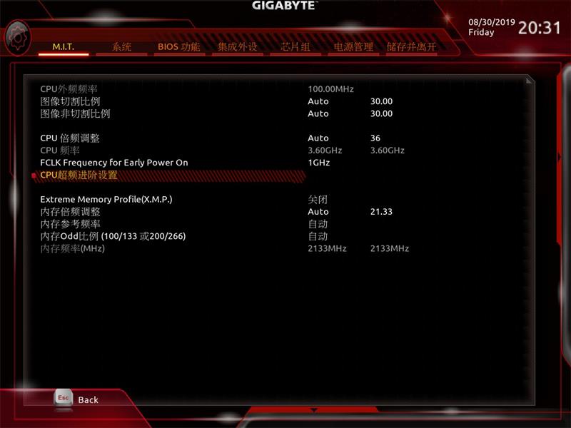 CPU超頻界面,可以設置CPU和內存頻率,不過由于B365并不支持超頻,因此只能調低頻率,并不能真正超頻,內存則最多能支持到2666MHz。