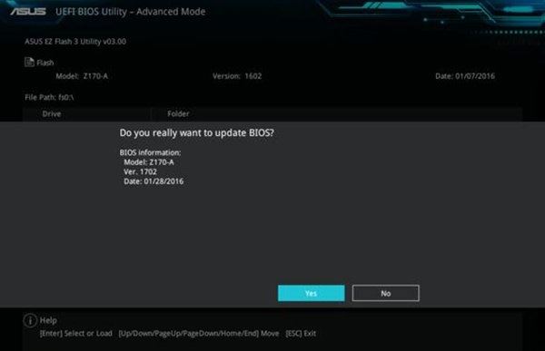 5、選擇Storage模式之后,之后就可以看到U盤中存放好的BIOS升級文件。選中我們在U盤中下載好的BIOS文件,提示是否驗證并刷新bios,我們點擊Yes鍵確定,下面EZ Flash就開始自動進行BIOS的更新了。