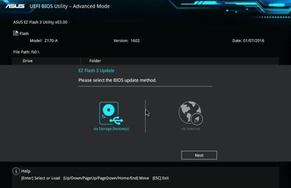 4、BIOS升級有 Storage 和 Internet(聯網)兩種升級BIOS方式。一般不建議使用網絡來更新主板BIOS,萬一網絡不好,導致BIOS程序更新失敗就麻煩了,而選擇 Storage模式 升級相當于是本地更新,更為安全。