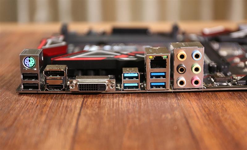 背板I/O接口方面,共有6個USB接口,分別是2xUSB 2.0、4xUSB 3.0。另外還有RJ45、PS/2、DP、DVI、HDMI接口各一個以及6x3.5mm音頻接口。