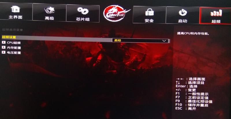 超頻主界面。需要將“超頻設置”改為啟動模式后,下面的超頻設置才會生效。