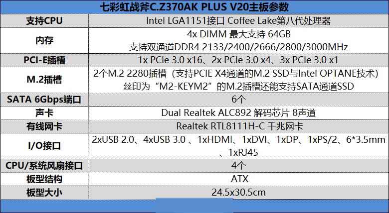 七彩虹戰斧C.Z370AK PLUS V20采用ATX版型結構,主板大小為24.5x30.5cm。