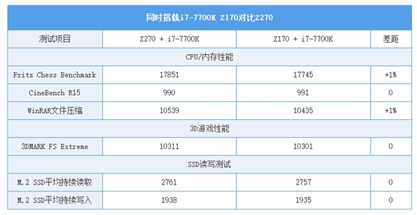 通過對比上面兩組數據,可以看到在Z170主板上,i7-7700K是能完美發揮其性能的,性能完全沒有差別。如果您說百分之一的差別也算是差別的話,那小編沒話說了……