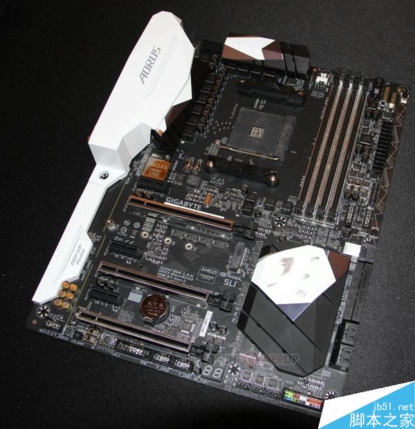 接下來是AX370 Gmaing K5,隸屬于Aorus電競序列,7相供電和鐵氧體電感,還有RGB LED裝飾燈。三條PCI-E 3.0 x16(x16/NA/x4或者x8/x8/x4)、三條PCI-E 3.0 x1,八個SATA 6Gbps,兩個SATA Express 16Gbps,一個32Gbps M.2,四個USB 3.1,六個USB 3.0,八聲道AMPUp!,Intel千兆網卡。