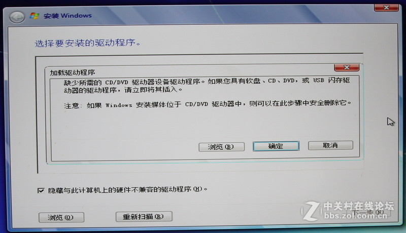 Windows 7沒有整合XHCI(USB2.0/USB3.0/3.1)驅動,如果用Windows 7 PE開機,或者用win7 U盤安裝win7,進入Win7安裝界面就會出現找不到安裝盤的情況。下圖就是用win 7 U盤安裝進入安裝界面后要調用win7安裝文件,這些文件在U盤,但是由于win7沒有XHCI驅動就找不到U盤,也就沒有辦法繼續安裝,同時提示加載驅動。