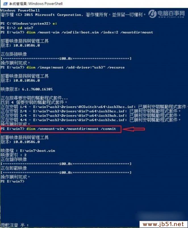 輸入或復制貼上下列指令即開始掛載映像,并搜尋usb3文件夾內的XHCI驅動整入到 install.wim 映像檔中。