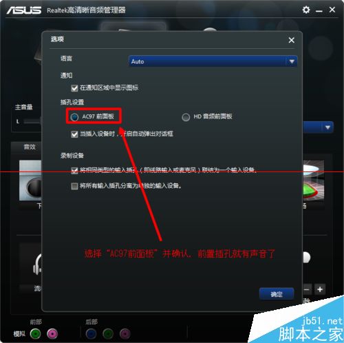3、如果圖中插孔項選擇了“HD音頻前面板,則前插孔沒有聲音;點擊選中”AC97前面板“選項,點擊確定后,前置面板插孔就有聲音了。希望能幫到你!