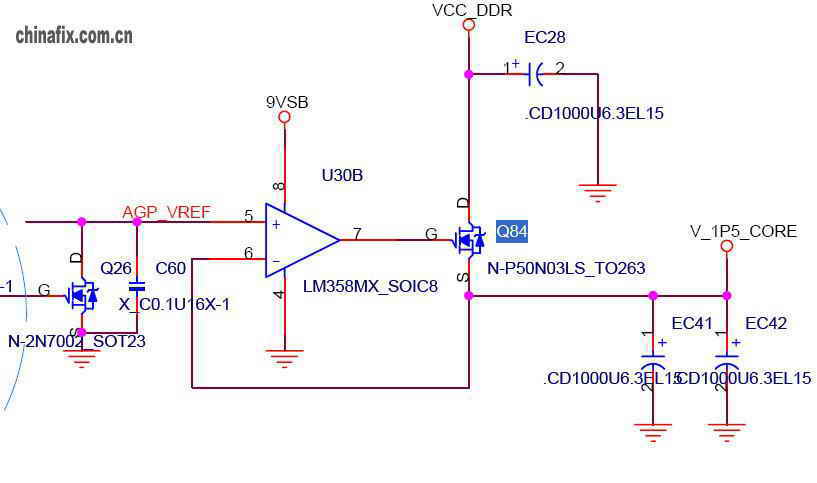 接著查G極的控制電壓,發現是由LM358這個雙運算放大器來提供的。與用來給Q84提供控制電壓的腳位有4、5、6、7、8腳,其中8腳為9VSB輸入,7腳是給Q84提供控制電壓的輸出腳,6腳為反饋腳與Q84的S極相連,用來監控輸出的電壓是否正常,5腳為VREF電壓腳。4腳為接地。逐一量測之后,發現5腳的VREF電壓不正常,只有0.9V,而正常的VREF電壓應為1.5V,即與Q84的S極輸出的電壓等同。
