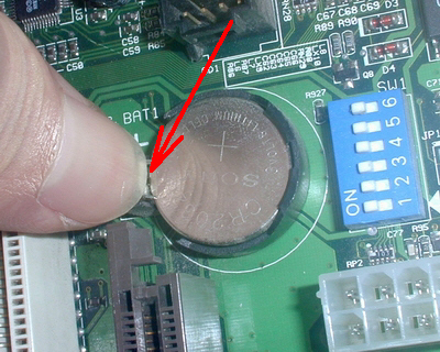 CMOS電池插座分為正負兩極,將它們短接就可以達到放電的目的。首先將主板上的CMOS供電電池取出,然后使用可以有導電性能的物品(螺絲刀、鑷子等導電物品),短接電池插座上的正極和負極就能造成短路(如下圖所示),從而達到CMOS放電的目的。