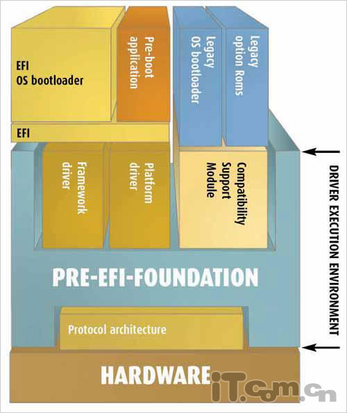 對于操作系統(tǒng)來說,如果主板使用的是BIOS,那么操作系統(tǒng)就必須面對所有的硬件,大到主板顯卡,小到鼠標鍵盤,每次重裝系統(tǒng)或者系統(tǒng)升級,都必須手動安裝新的驅(qū)動,否則硬件很可能無法正常工作。而基于EFI的主板則方便很多,因為EFI架構(gòu)使用的驅(qū)動基于EFI Byte Code。EFI Byte Code有些類似于Java的中間代碼,并不由CPU直接執(zhí)行操作,而是需要EFI層進行翻譯。對于不同的操作系統(tǒng)來說,EFI將硬件層很好地保護了起來,所有操作系統(tǒng)看到的,都只是EFI留給EFI Byte Code的程序接口,而EFI Byte Code又直接和Windows的API聯(lián)系,這就意味著無論操作系統(tǒng)是Windows還是Linux,只要有EFI Byte Code支持,只需要一份驅(qū)動程序就能吃遍所有操作系統(tǒng)平臺。