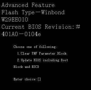 這就要選擇主菜單的[3.Advanced Feature],再選[2.Update BIOS including Boot Block and ESCD]進行升級。 如果沒有看到上面的警告信息,則表明新版BIOS無需更改Boot block,也就無需更改BIOS寫保護了。另外還有一個好處是,當升級失敗后,可以用下面的"利用BIOS Boot Block引導塊"的方法修復BIOS。