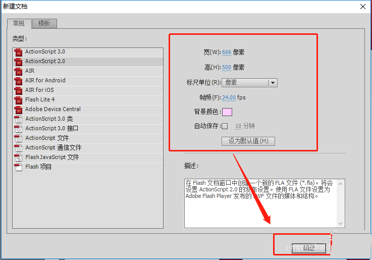 2、彈出“新建文檔”的對話窗口,在這個新建文檔窗口中設置flash文檔的大小等屬性然后進行創建。