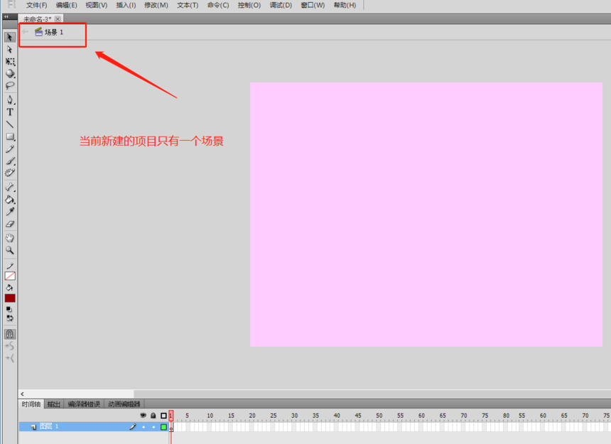 3、創建了這個flash項目之后我們可以在flash軟件界面的左上角看到當前項目只有一個場景1.