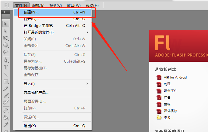 1、雙擊flash的軟件快捷圖標啟動打開這個軟件,然后執行文件菜單欄中新建命令。
