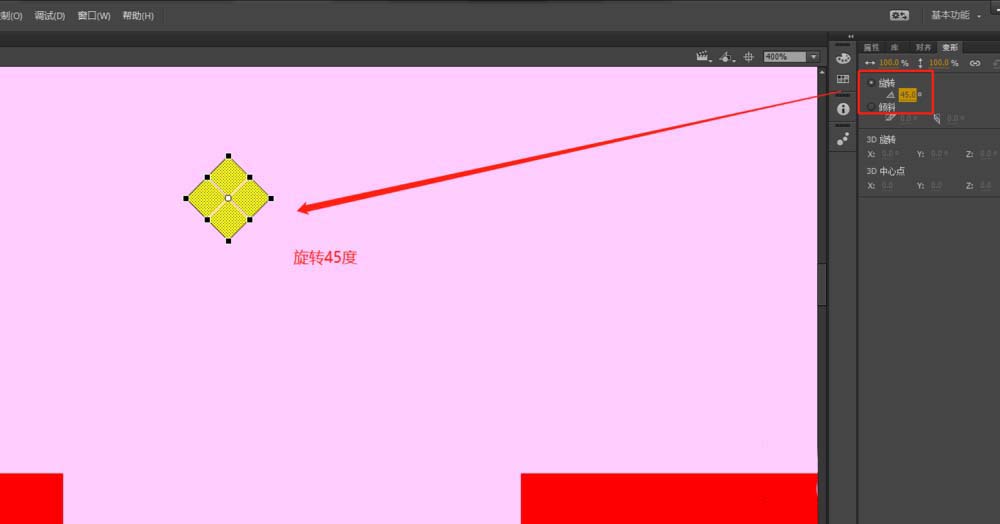 4、同時選中四個小正方形,打開變形窗口,在變形窗口中設置旋轉角度為45度。