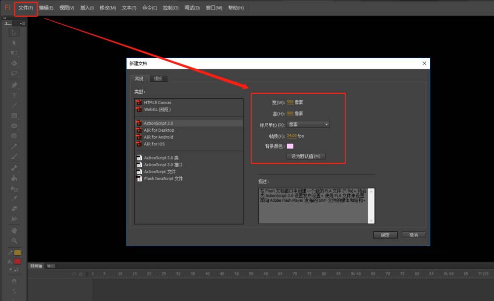 1、啟動flash cc軟件,選擇文件中的新建命令,設置flash文檔舞臺的大小等,來創建一個flash項目。