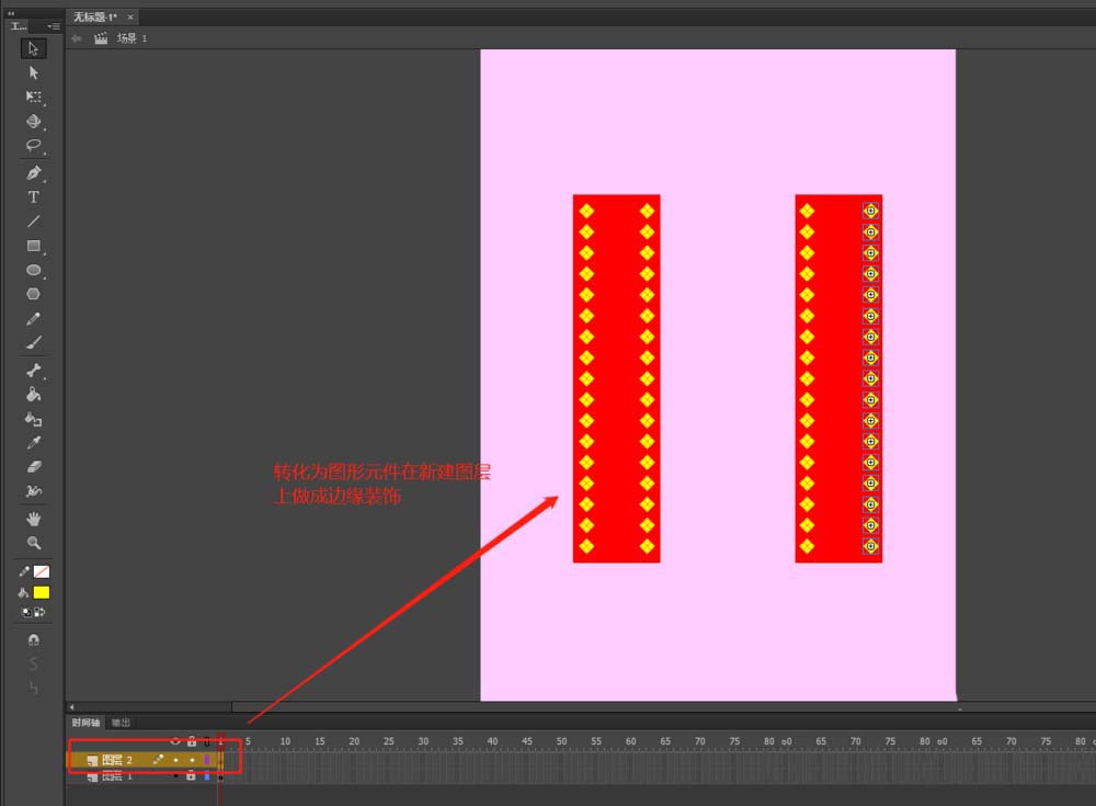 5、將上一步繪制的四個小正方形轉換為圖形元件,然后刪除新建一個圖層,在新建圖層上拖入元件,并進行復制,得到一個邊緣裝飾效果。