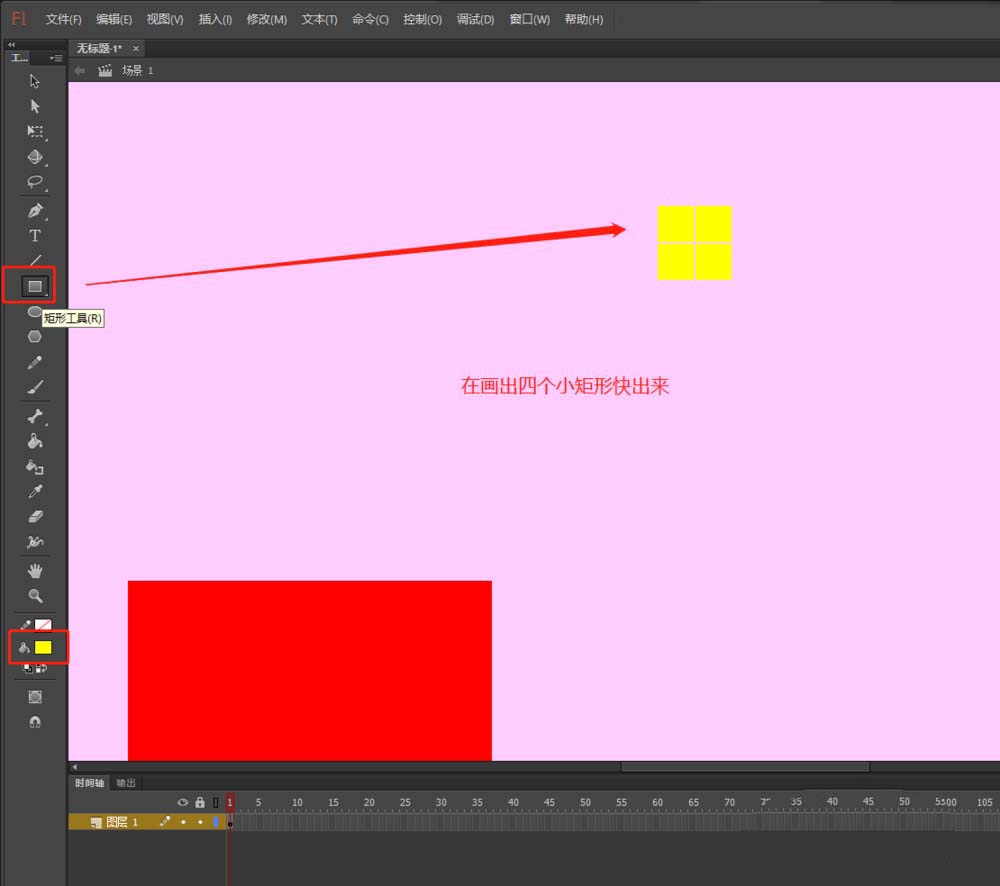 3、用放大鏡工具放大舞臺畫布,然后更改填充顏色為黃色,在使用矩形工具來繪制一個很小的正方形圖形出來,并復制出四個。