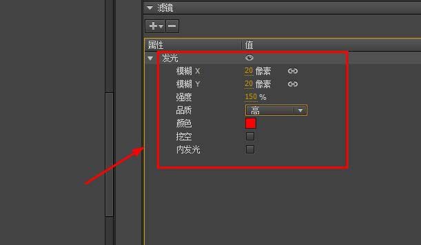 7、第30幀處選擇元件,在屬性面板中找到濾鏡選項,添加發光濾鏡
