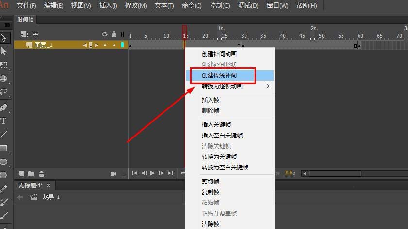 9、選擇普通幀右鍵選擇創建傳統補間,也就是動作補間動畫