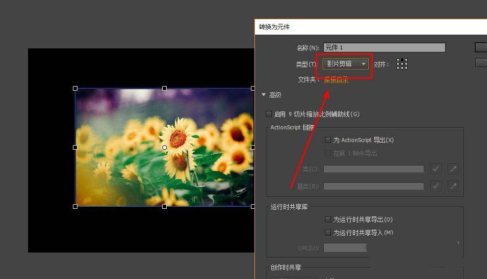 5、選擇影片剪輯元件,因為在FLASH中,只有文本、影片剪輯、按鈕元件才有濾鏡的使用