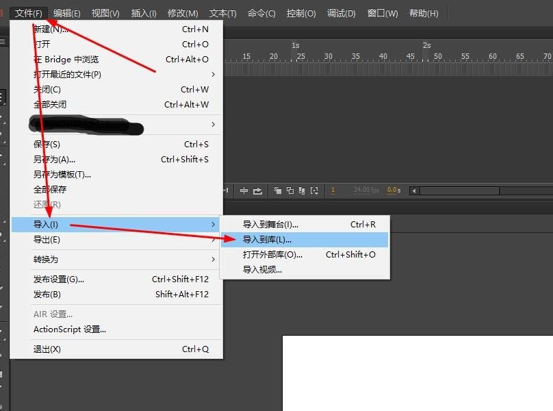 2、依次選擇文件---導入---導入到庫,瀏覽到聲音素材,點擊確定。