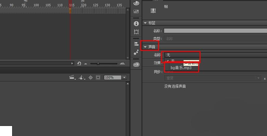 3、在主時間軸延長幀,然后在幀屬性中選擇聲音。