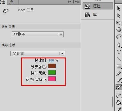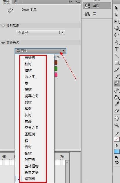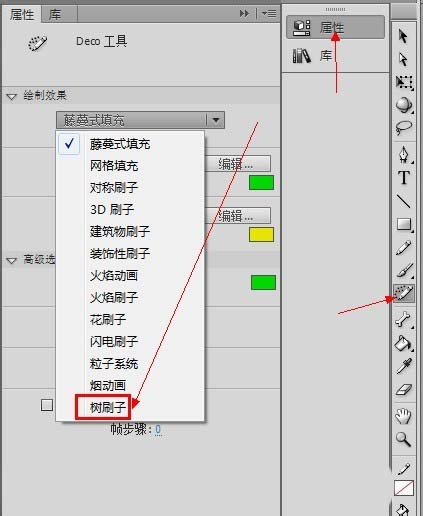 2、在工具欄中選擇deco工具,打開其屬性面板,從繪制效果中的下拉菜單里選擇樹刷子