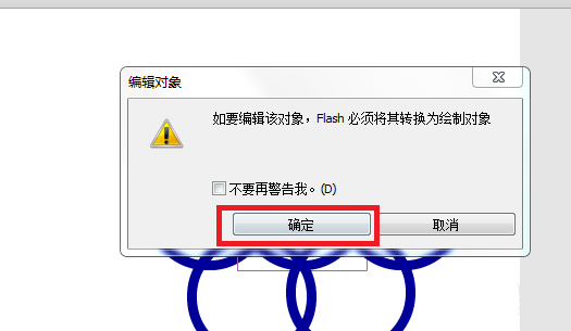 6、雙擊第一行中第二個圓環形狀,Flash cs 3會跳出“編輯對象”對話框提示用戶是否將其轉換為繪制對象,然后單擊“確定”按鈕,如圖所示。