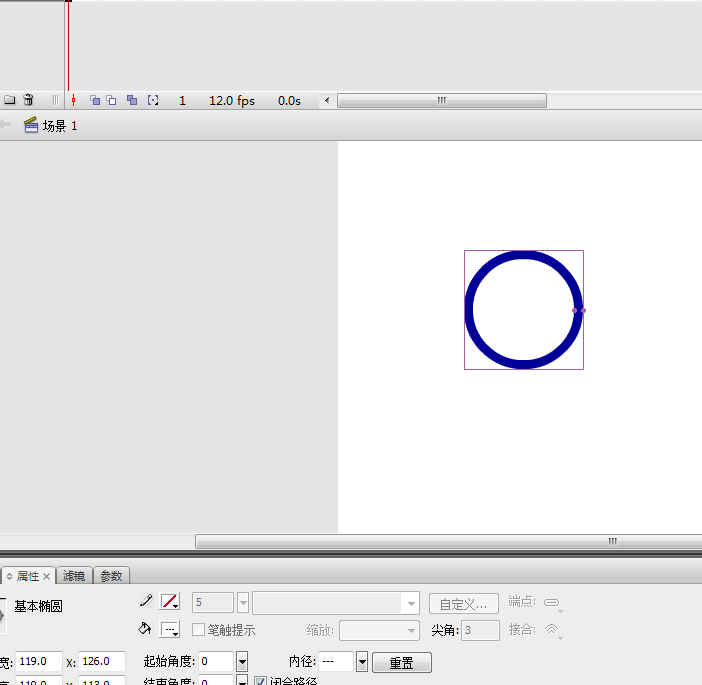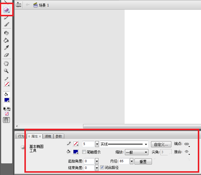 2、在工具箱中選擇“基本橢圓”工具,在它的”屬性“面板中設置筆觸顏色為透明,填充顏色為藍色,在”內徑“文本框中輸入數值85,如圖所示。