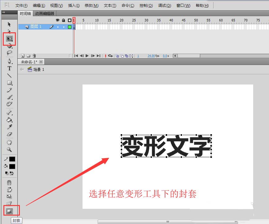 5、拖動鼠標左鍵選中所有打散后的文字,選擇任意變形工具,單擊任意變形工具下的封套,這時候文字會出現很多控制點。