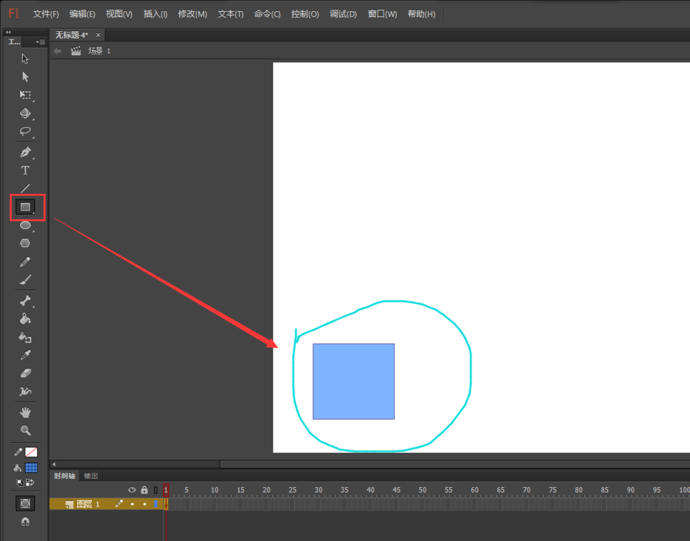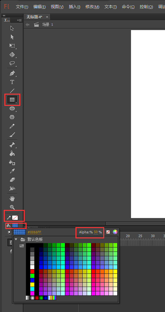 2、進入到flash軟件之后,選擇矩形工具,設置矩形的筆觸顏色為無,填充顏色為藍色,設置藍色的不透明度為50%,勾選對象繪制,然后在場景舞臺上繪制一個大小合適的矩形出來。