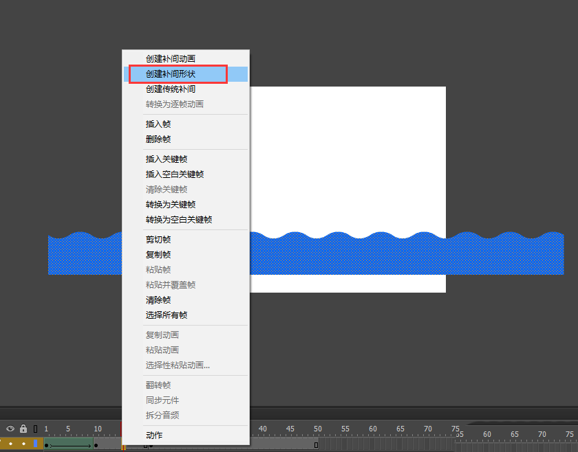 5、框選中所有矩形,直接按快捷鍵Ctrl+B進行分離;然后在時間軸的第10幀插入一個關鍵幀,選中第10幀,選中所有矩形,執行修改——變形——水平翻轉操作;然后在第1幀與第10幀之間右鍵鼠標選擇創建一個補間形狀動畫。