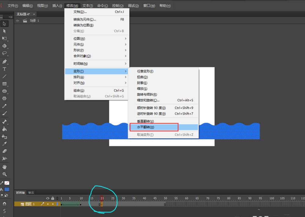 7、在時間軸第20幀的位置按F6插入一個關鍵幀,框選中整個所有矩形,再次執行修改——變形——水平翻轉命令;然后依然在第10幀與第20幀之間創建一個補間形狀動畫。