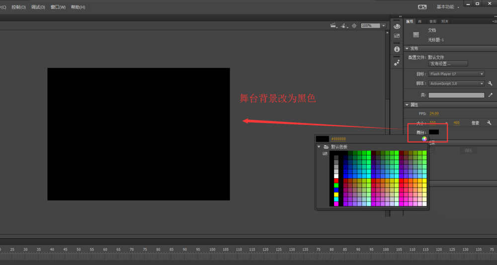 2、由于創建的flash文檔其默認的背景顏色使白色的,所以我們在屬性的背景顏色設置中將flash文檔背景顏色改為黑色。