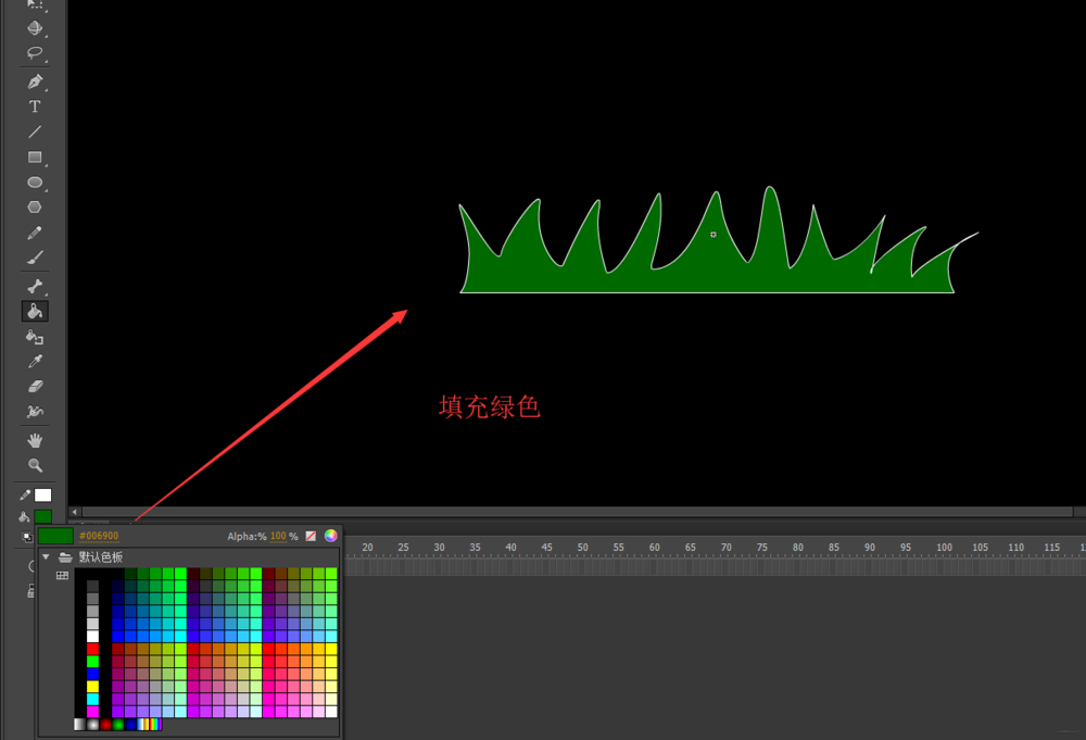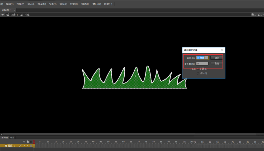 7、使用顏料桶為小草填充一個綠色的顏色填充,并在修改菜單的圖形中找到柔化邊緣命令,執行柔化邊緣操作得到一個小草的圖形元件。