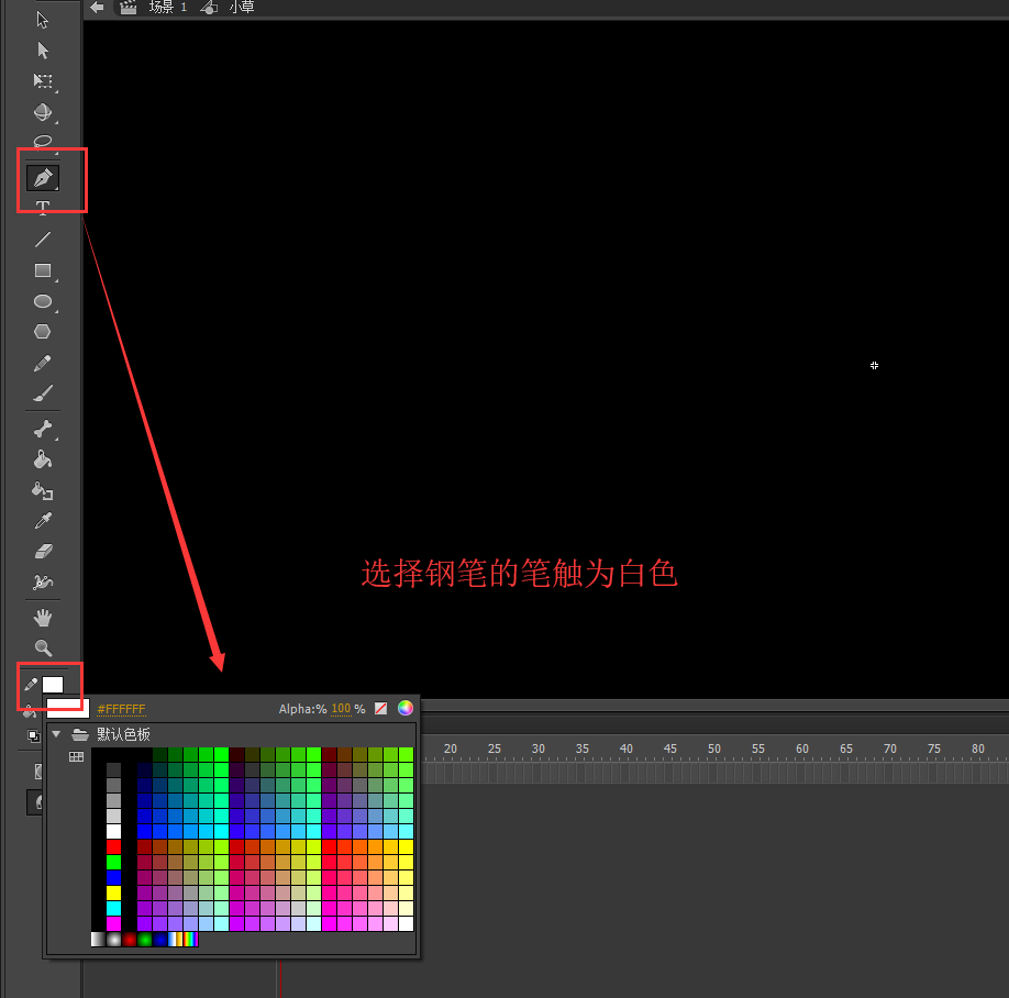 5、選擇鋼筆工具,然后點開筆觸顏色的色塊,設置鋼筆的筆觸顏色為白色顏色,大小為1像素。