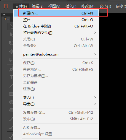 1、雙擊flash啟動軟件之后,在文件菜單中選擇新建命令,來創建一個新的flash文檔。