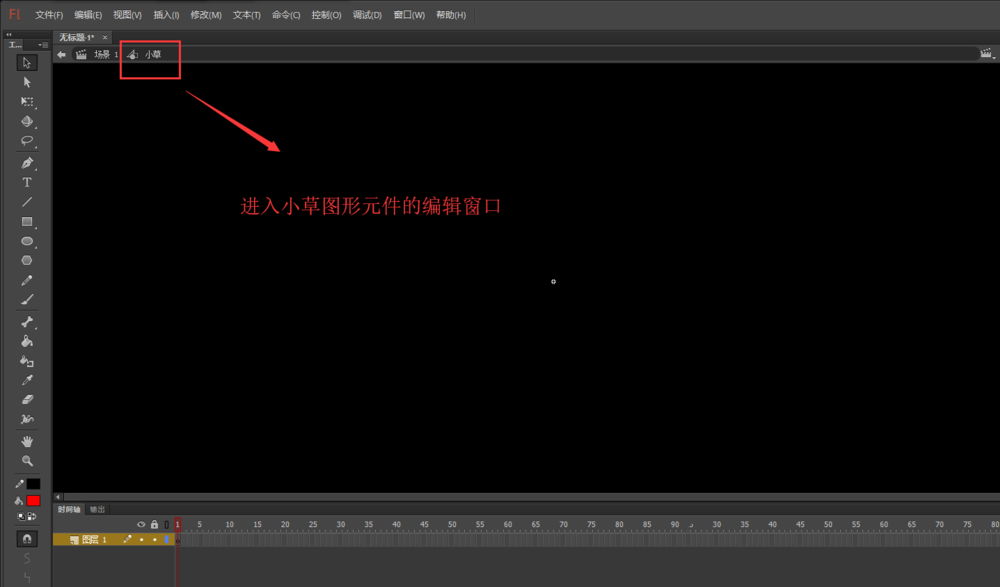 4、創建完小草的圖形元件之后,flash界面會進入到該圖形元件的編輯界面中。不在顯示場景了。