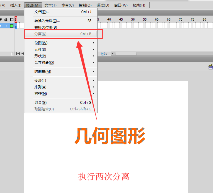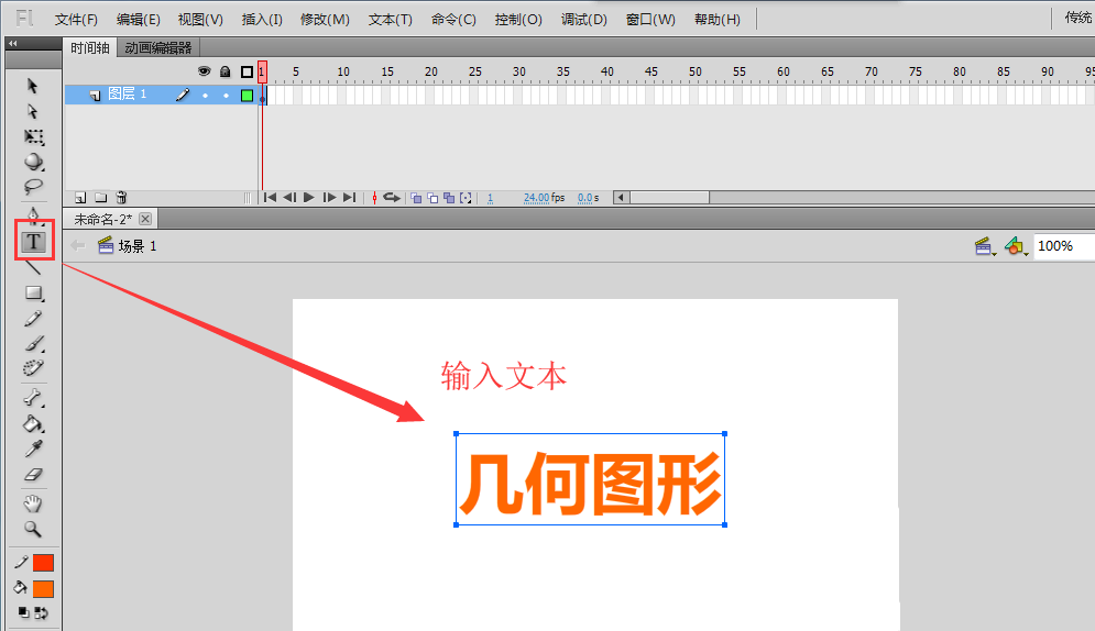 2、用文本工具在場景舞臺中單擊鼠標,然后在光標閃動的位置輸入標題文本內容“幾何圖形”這幾個字。